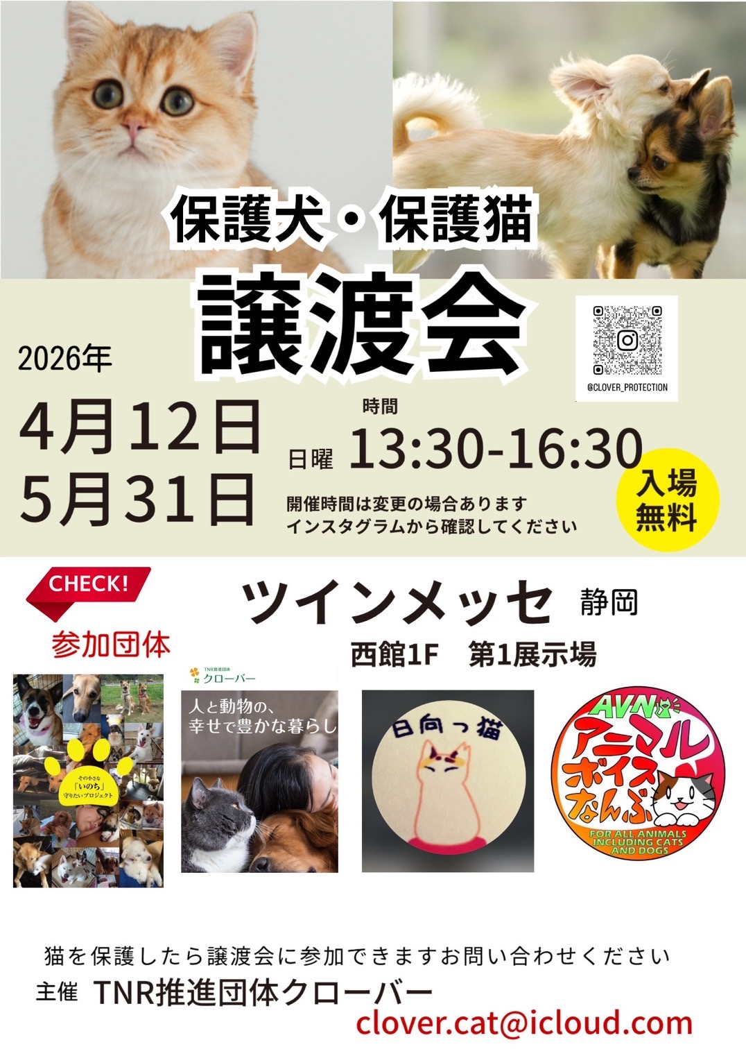 入場無料 一般 2026年04月12日 保護犬・保護猫譲渡会・野良猫相談会 -